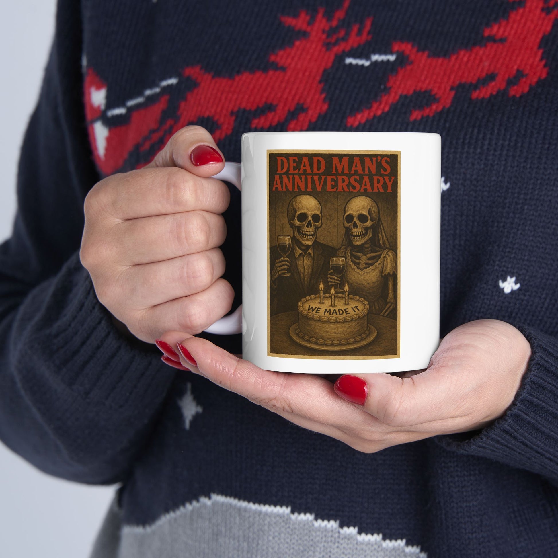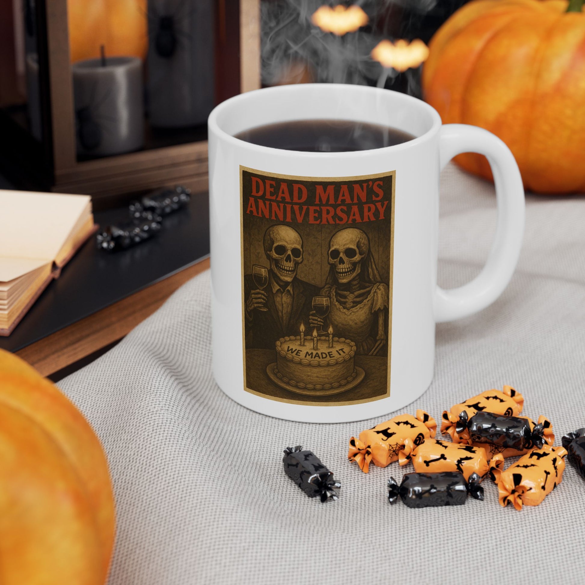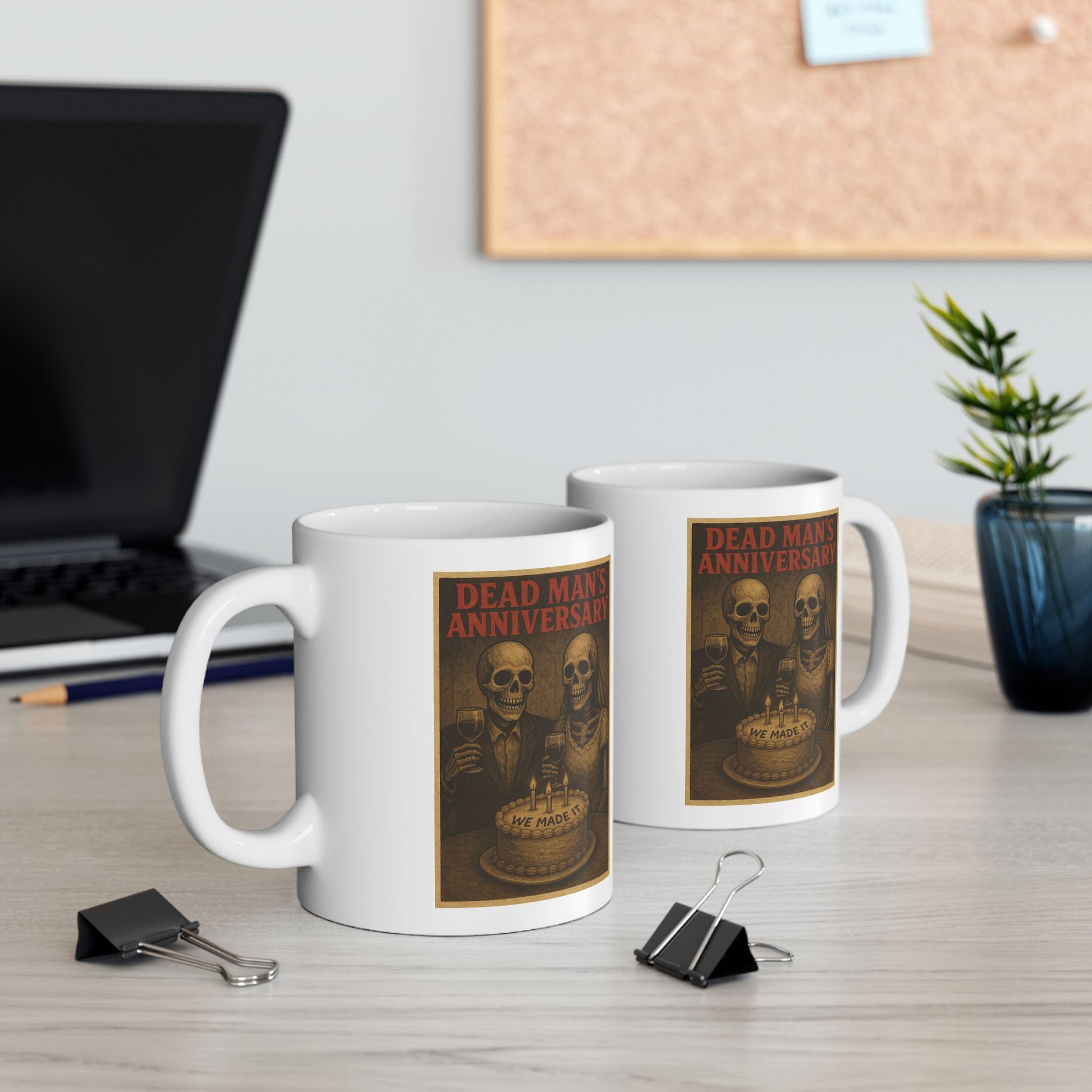 Love lasts a lifetime… and then some. Celebrate eternal commitment (or survival) with this hilarious Dead Man’s Anniversary mug, featuring a skeleton couple toasting over a cake that proudly reads “We Made It.” Perfect for couples who’ve endured it all — kids, careers, chaos, and still come out laughing (or at least dead inside together).