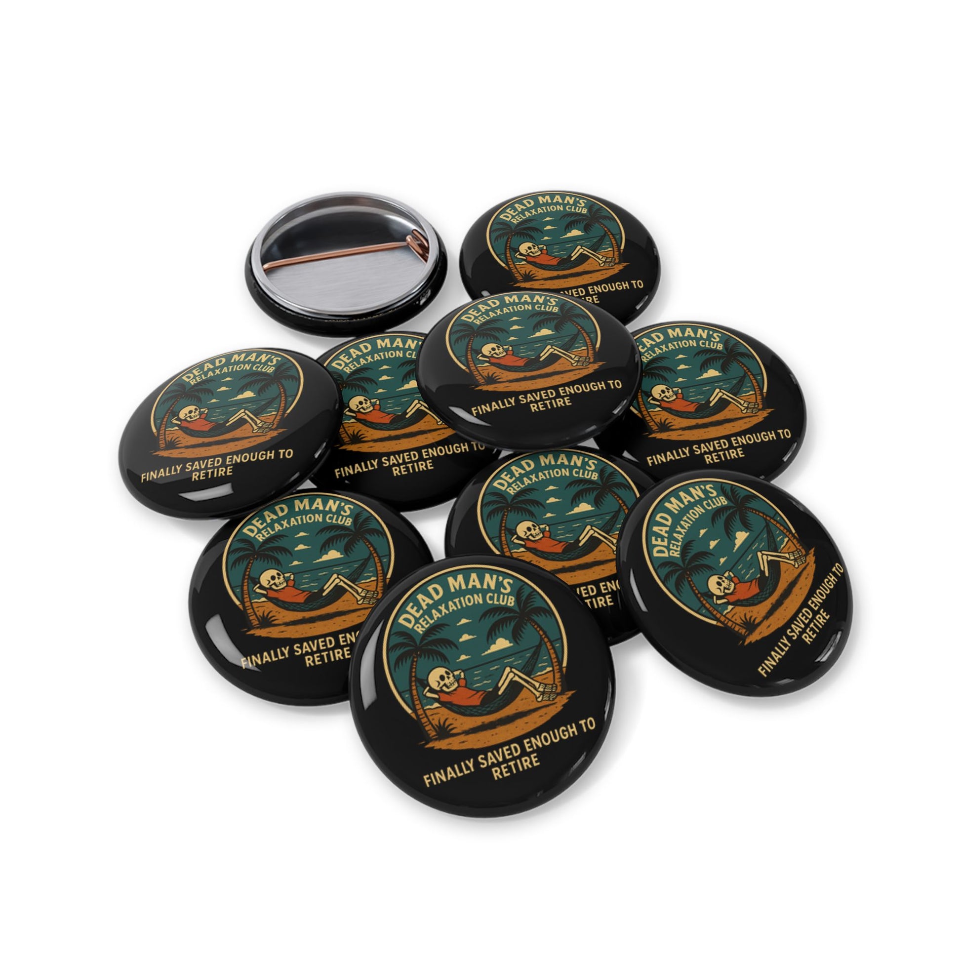 Give your retirement party some dark humor flair with the Dead Man’s Relaxation Club button pin. Featuring a chill skeleton swinging in a hammock under the phrase “Finally Saved Enough to Retire,” this retro-style pin says goodbye to the grind with just the right amount of sarcasm.