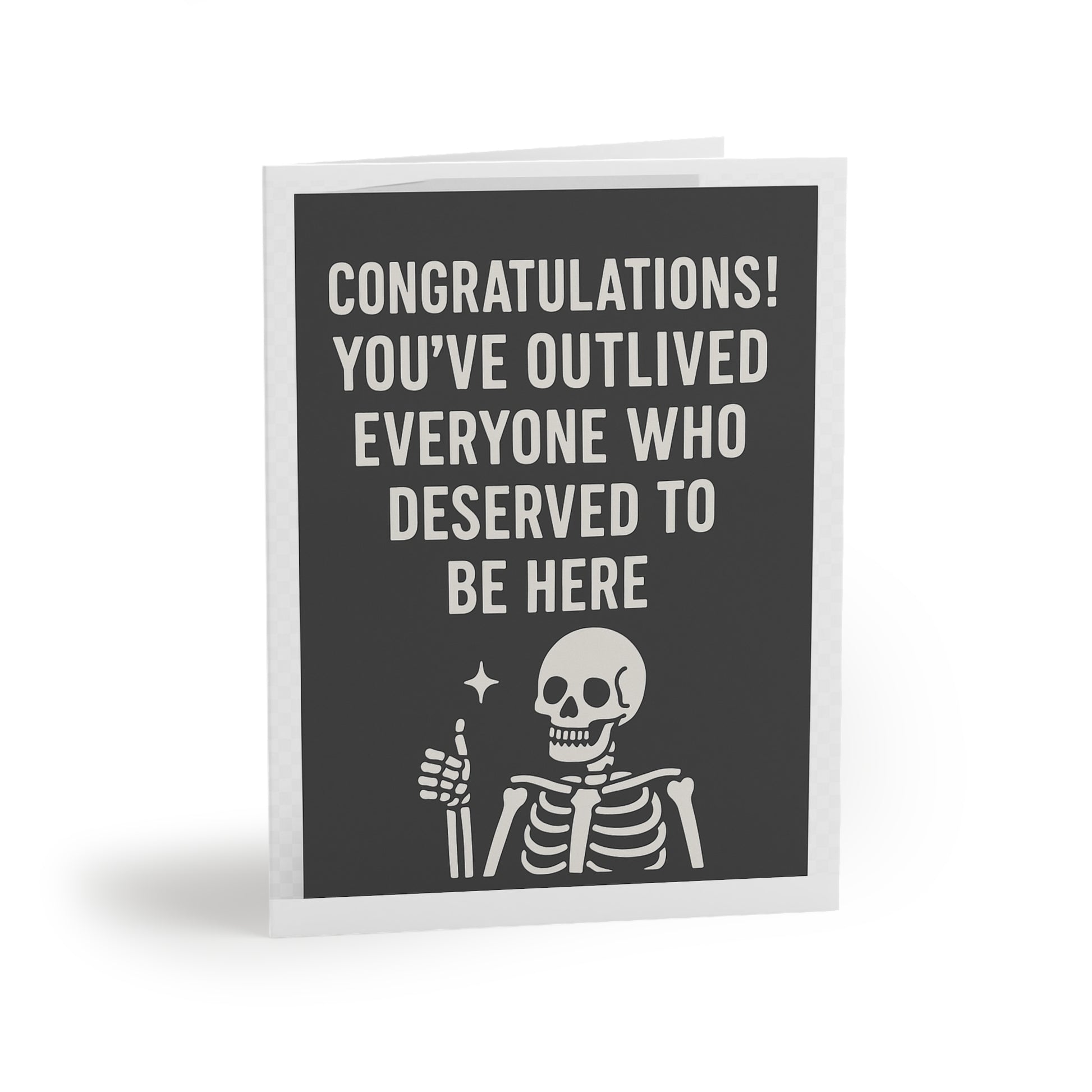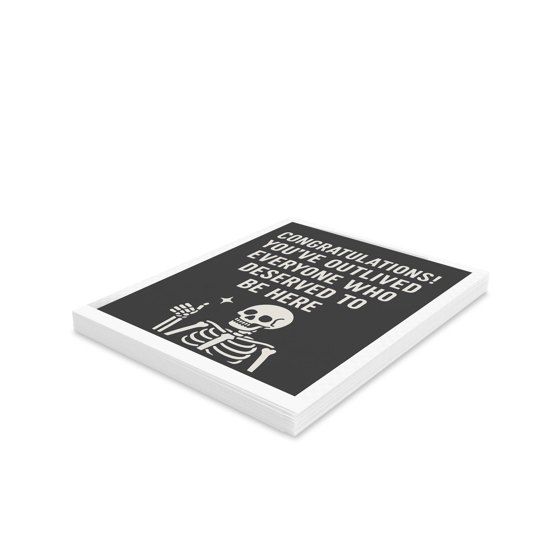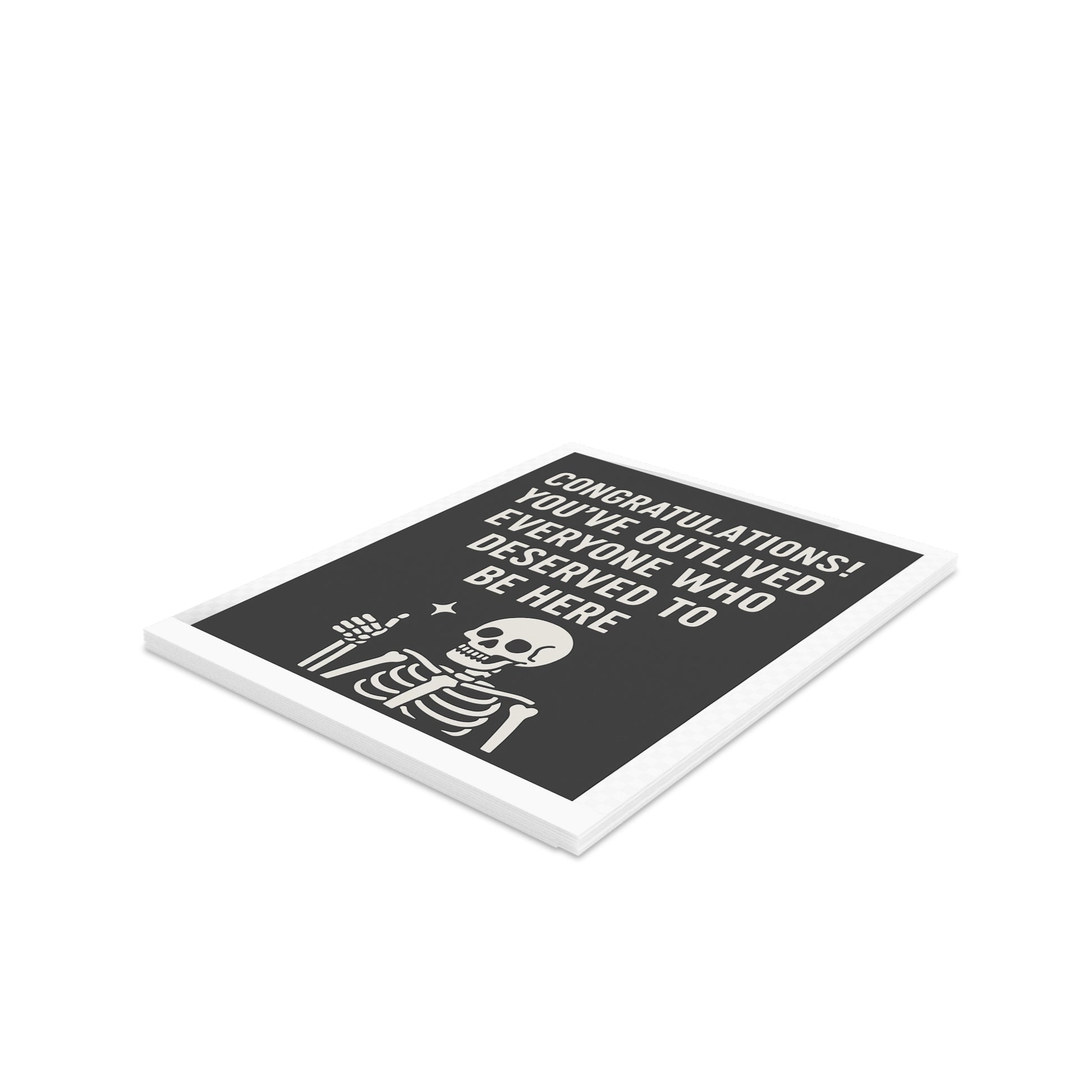 Celebrate longevity with a heavy dose of sarcasm. This dark humor greeting card features a smug skeleton and the brutally honest message: "Congratulations! You’ve outlived everyone who deserved to be here." Perfect for birthdays, retirements, or anyone with a morbid sense of humor and zero tolerance for sentimentality. Whether you're cheering on a friend’s resilience or just roasting them for sticking around too long, this card gets the job done—with style, sass, and skeletons. Brighten someone's day with our delightful greeting cards! Perfect for any occasion, these vibrant cards bring joy and a personal touch to your heartfelt messages. With their quirky designs and matte finish, they exude a fun yet sophisticated vibe, making them a great fit for birthdays, holidays, or just to say 'hello'. Ideal for friends who appreciate humor and creativity, these cards are sure to make anyone smile. Celebrate life's moments—big and small—with a unique twist!